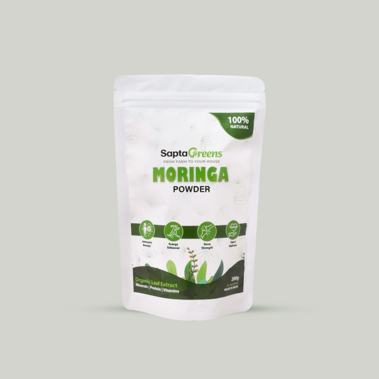 Moringa isn’t just another “green powder.” It’s nature’s complete performance fuel — with 90+ nutrients, 46 antioxidants, and 9 essential amino acids. Used for centuries in Ayurvedic medicine, it now fuels today’s active lifestyles — from gym floors to marathon tracks.At SaptaGreens, we blend ancient wisdom with modern performance needs. ✅ 100% pure moringa leaves ✅ Grown in India using sustainable practices ✅ Shade-dried for maximum nutrient retention ✅ Stone-ground for smooth mixability ✅ No stems. No fillers. No additives.Whether you’re training hard, recovering smart, or just trying to stay energized — this is your go-to green.